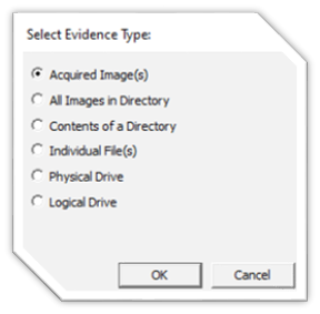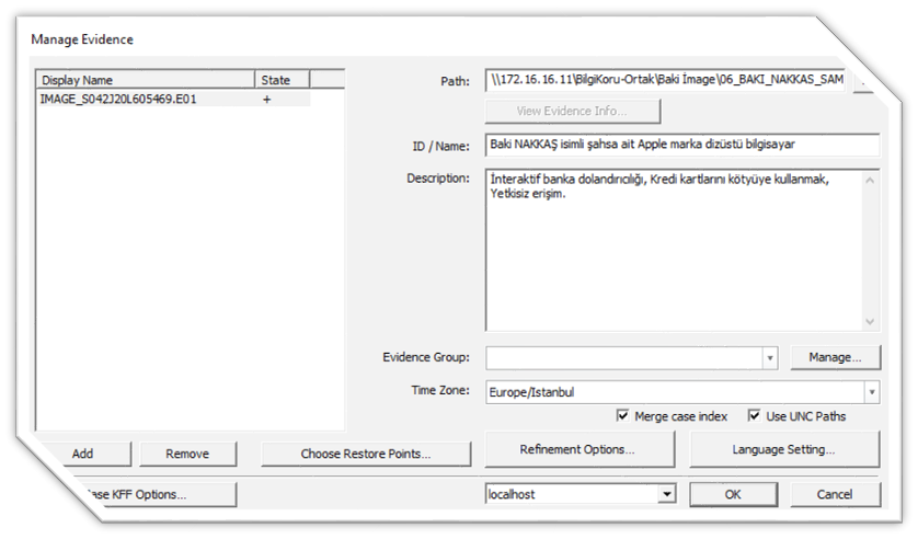 Yeni bir case oluşturduğumuzda, karşımıza “Manage Evidence” ekranı geliyor. Bu ekranda olaya imaj ekliyoruz. İsterseniz imaj dışında bilgisayarımız içeriğinde yer alan klasörleri, dosyaları, disk sürücülerini veya mantıksal sürücüleride ekleyebilirsiniz. Adli Bilişim standartları kapsamında inceleme gerçekleştirdiğimiz için daha önce alınan imaj dosyasını ekliyoruz. İmajı eklemek için "Add" sekmesine tıklamamız gerekmektedir. daha sonra karşımıza eklemek istediğimiz yapı karşımıza gelmektedir. Daha sonra yapmamız gereken işlemler ise delilin adını, açıklamasını yazıyoruz, “Time Zone” bölümünden time zone ayarlanıyor. “Merge Case Index” seçeneği seçilirse bu delilin indekslemesi olay indeksi ile birleştiriliyor. “Use UNC Path” seçilirse ağda bulunan bir delilde eklenebilir. Sol alt taraftaki “Add” butonuna basarak görüntü dosyamızı ekleyerek OK sekmesine tıklıyoruz ve imajı gösteriyoruz.