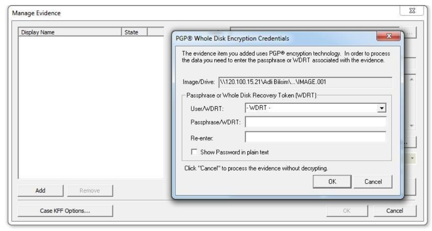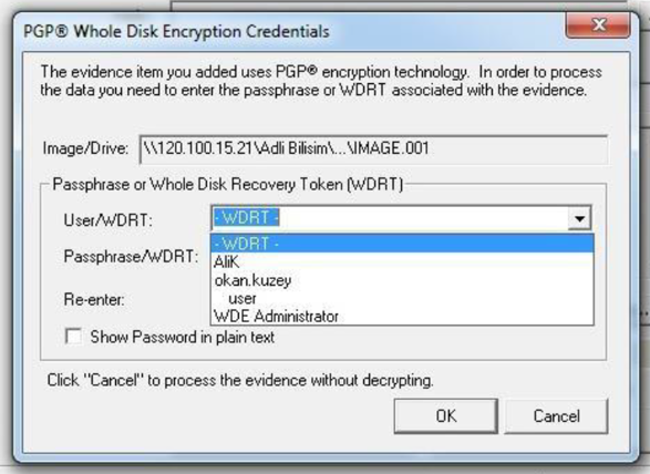 Olayımıza yeni bir delil eklediğimizde hard diskin şifrelenmiş olma ihtimali bulunmaktadır. PGP (Pretty Good Privacy) şifreleme sistemi kullanılarak şifrelenmiş olabilir. PGP, bir veri şifreleme ve veri çözme yöntemidir. PGP genellikle dosya imzalama, metin, E-posta, hard disk ve dizin şifreleme gibi iletişim güvenliğini artırma yöntemlerinde kullanılır. PGP bir dizi şifreleme algoritmasını destekler. IDEA, RSA, DSA, MD5, SHA-1gibi. Eğer delilimiz PGP şifreleme sistemi ile şifrelenmiş ise karşımıza aşağıdaki gibi bir pencere çıkacaktır. PGP ile şifrelenmiş bir alanın içeriğini görebilmek için şifresini bilmemiz gerekmektedir. Bu pencerede User/WDRT açılır penceresinde şifresini gireceğimiz kullanıcı seçilir. Passphrase/WDRT ve Re-enter bölümlerine şifre girilerek OK butonuna basılır.