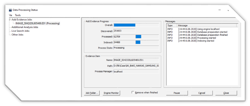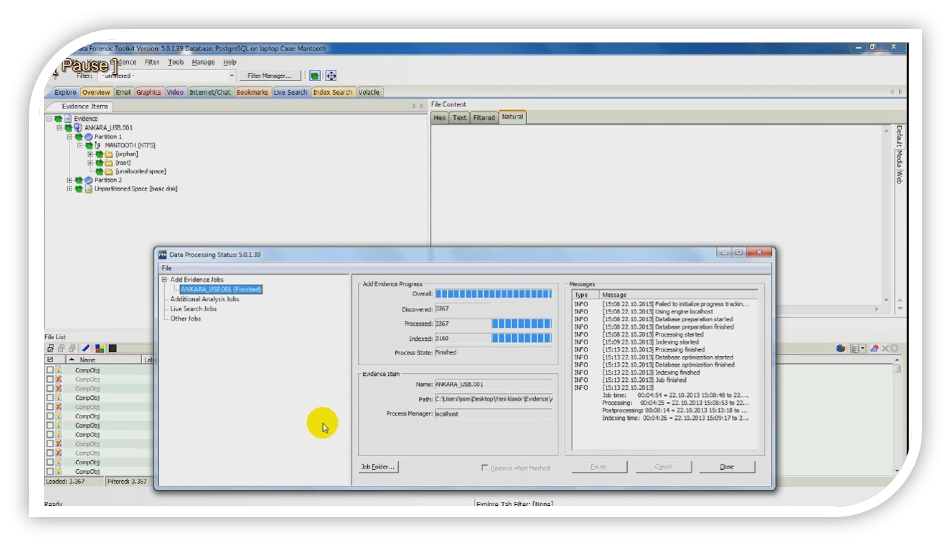 Gerekli tüm ayarlamaları yaptıktan sonra imajımızın Process işlemlerini başlatıyoruz. Process işlemlerin bitme süresi imaj dosyası içeriğindeki veriler, imajın bulunduğu hard diskin hızı, inceleme yaptığımız bilgisayarın işlemci, ram ve hard diskin özelliklerine göre farklılık göstermektedir. Günümüzde veri kullanımının yoğunlaşması, hard disk kapasitelerinin yüksek olması ve incelenen imajların Process seçeneklerinin çok olması nedeniyle üst düzey özelliklere sahip veya Workstation tarzı bilgisayarlar kullanılması gerekmektedir.