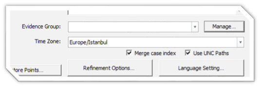 “Manage Evidence” sekmesinde yer alan Language Setting içeriğinde mutlaka dil ayarlamaların yapılması gerekmekltedir. İncelediğimiz medyanın kullanmış olduğu dil neyse o dil seçeneği işaretlenmelidir. Refinement Options sekmesinden ise oluşturduğumuz process işlemlerini kontrol edebilir veya ekleme çıkarma işlemi sağlayabiliriz. Son olarak ise Choose Restore Points sekmesi üzerinden yüklü bulunan işletim sistemlerinin gölge kopyaları var ise koplayarın analiz edilip edilmeyeceğinin belirlendiği yerdir. Özellikle Windows bir işletim sistemi inceliyorsanız gölge kopya (Shadow) dosyalarını mutlaka seçmeniz gerekmektedir.