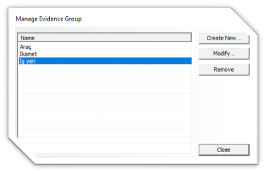 Bir olayda bir şahsın evinde, işyerinde ve arabasında yapılan aramalarda deliller elde edilmişse olay içinde bu delilleri gruplayabiliyoruz. Bunun için delil eklediğimiz Manage Evcidence bölümüne giriyoruz. Gruba ekleyeceğimiz delili Display Name bölümünde seçili hale getirdikten sonra Evidence Group açılır penceresinden delili ekleyeceğimiz grubu seçiyoruz. Daha önce grup oluşturulmamışsa açılır pencerenin sağındaki Manage butonuna basıp açılan pencerede Create New butonuna basıp yeni açılan pencerede yeni oluşturacağımız grup ismini yazıyoruz. Eğer oluşturacağımız grubu diğer olaylarda kullanacaksak “Share With Other Cases” seçeneğini işaretliyoruz. Create butonuna basarak yeni grubumuzu oluşturuyoruz. Başka bir grup oluşturmayacaksak Manage Evidence Group penceresini Close butonuna basarak kapatıyoruz. Yeni grup veya gruplar oluşturmuş olduk. Şimdi delilimizi eklemek istediğimiz grubu seçerek Manage Evidence penceremizi OK butonu ile kapatıyoruz. Böylelikle delilimizi gruplandırmış oluyoruz.