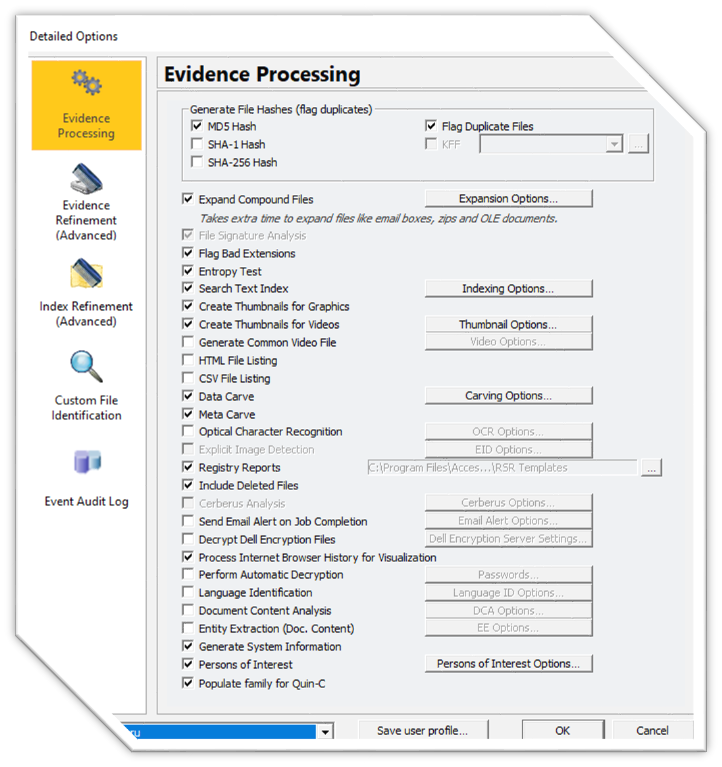 Evidence Processing sekmesi içerisinde yer alan tüm işlemleri öğrendikten sonra inceleyeceğimiz olaya yönelik hangi processlerin çalıştırılacağını işaretlememiz gerekmektedir. Tüm sekmelerinin hepsini seçmemiz analizlerin çok uzun sürmesine sebebiyet vermekte ve zaman kaybına neden olmaktadır. Bu nedenle inceleyeceğimiz olaylara yönelik analizlerin ve suç unsuru olabileceği düşünülen verilerin neler olacağını belirledikten sonra gerekli işlemleri başlatmalıyız. Process ekranındaki seçenekler seçildikten sonra bu process seçenenekleri yeni bir profil olarak kaydedilebilir.