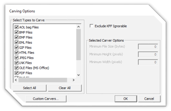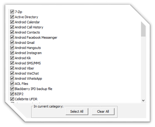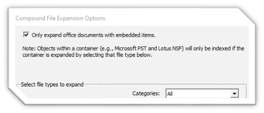 Expand Compound Files: Sıkıştırılmış veya birleştirilmiş dosyaların genişletilmesini sağlamaktadır. “Expansion Options” butonundan açılmasını istediğimiz dosya çeşitlerini seçebiliyoruz. Bu pencerede bulunan “Only Expand Office Documents with embedded items” seçeneği işaretlendiğinde içerisinde ofis dosyalarının gömülü olduğu dosyaları da açıyor.(Powerpoint dosyası içerisinde gömülü olan Word, excell vb gibi). Programı kullanırken Select All seçeneğini seçeceğiz.