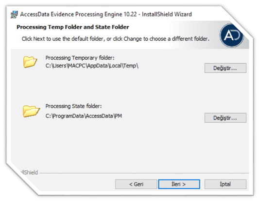 - Postgre SQL programı kurulumu tamamlandıktan sonra Processing Engine kurulumuna geçiyoruz. Processing Engine programı inceleme yapacağımız imaj veya medya üzerinde bizlerin belirlediği seçenekler üzerinden çözüm işlemleri gerçekleştirilmektedir. Aşağıda yer alan kurulum ekranında TEMP dosya yollarını SSD teknolojisine sahip disk üzerindeki sürücü içeriğine göstermeniz önerilmektedir. Böylelikle Process işlemleriniz daha kısa sürede tamamlanacaktır.