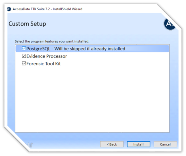 FTK (Forensic Tool Kit) kurulumu için öncelikle web sitesine eriğim sağlayarak product-download-page sekmesinden kurmak istediğimiz sürümün iso dosyasını indirmemiz gerekmektedir. İlgili versiyon seçimi ve indirme işlemleri tamamlandıktan sonra kurulum 4 aşamadan oluşumaktadır. Bunlar sırasıyla PostgreSQL (veri tabanı), Evidance Processor, Tool Kit ve CodeMeter kurulumudur.