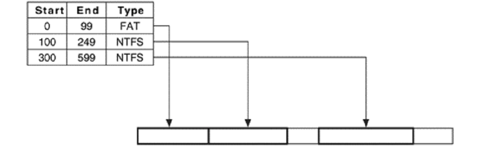 Genellikle her partition sisteminin bir ya da birden fazla tablosu bulunur. Bu tablolar genellikle partitionlara ait, başlangıç sektörü, bitiş sektörü ve dosya sistemi bilgilerini tutar. Aşağıda bir tabloda 3 partition’a ait tablo girdileri görülmektedir.