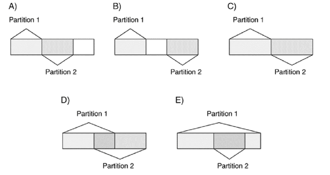İlk senaryoda (B),iki partition arasında bir partition’a dahil olmayan sektörler vardır. Burada gizli veya silinmiş veri bulunabilir. İkinci senaryoda (C),bir partition diğerinden hemen sonra gelir. Üçüncü senaryoda (D) partition 1 bitmeden, partition 2 başlamıştır ve bu partition tablosunun çökmüş olduğuna bir işarettir. Hangi partition’ın doğru olduğuna içlerindeki veri incelenerek karar verilir. Dördüncü senaryo ise (E), ikinci partition, birincinin içindedir. Hatanın nerede olduğunu anlamak için her partition içindeki veriler incelenmeli.